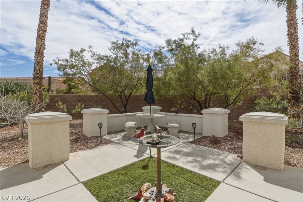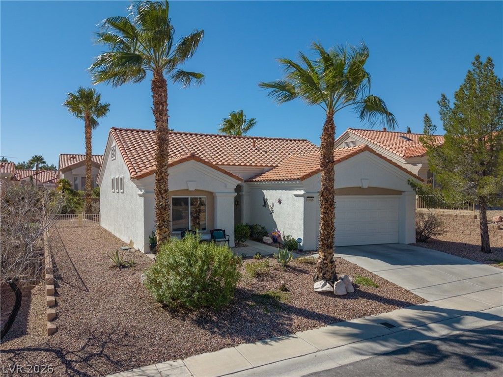 Discover your ideal retirement home in the 55+ community of Sun City Summerlin. This charming single-story gem features 2 bedrooms, 2 bathrooms, a fully fenced backyard, & a 2-car garage with golf cart parking. Inside, abundant natural light, high ceilings, & tile flooring create an open, airy feel. The living & dining areas flow seamlessly & open to the backyard through sliding doors?perfect for everyday living. The kitchen offers a breakfast bar, a casual dining area, built-in appliances, & plenty of cabinetry. The master suite features a bay window, a walk-in closet, & a private bath with a walk-in shower. A spacious secondary bedroom & a small flex room off the kitchen is ideal for an office or craft space. Step outside to a peaceful, Zen-inspired backyard with a covered patio & low-maintenance desert landscaping?perfect for relaxing. Enjoy Sun City Summerlin's outstanding amenities, including a pool, golf course, clubhouse, tennis courts, and more designed for an active lifestyle.