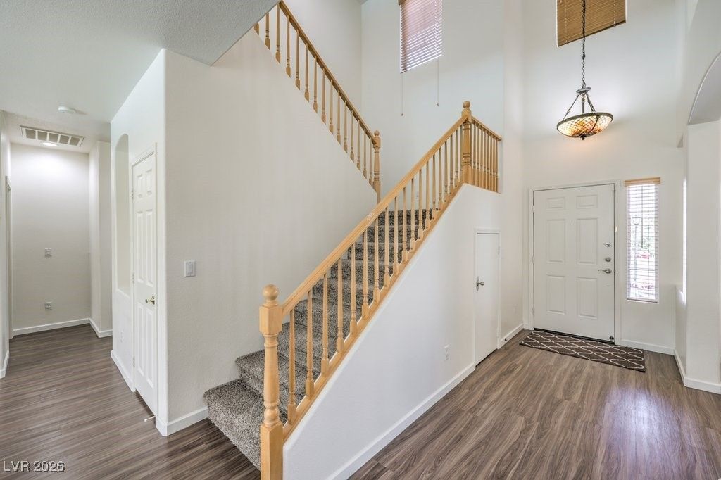 Absolutely gorgeous home located in the desirable Lone Mountain community, featuring three bedrooms with a primary bedroom on the main level. Step into a private backyard with a pool, spa, waterfall feature, large yard, palm trees, hill, high brick wall for added privacy, and a barbecue area. The community offers hiking trails, walkways, and gated access, with weekly pool service and monthly landscaping included. Located approximately 10 minutes from Downtown Summerlin, Red Rock Resort & Spa, shopping, dining, entertainment, movie theaters, baseball stadium, and arena. The kitchen features Viking stainless steel appliances and a large island. Interior includes LED lighting with dimmers, ceiling fans throughout, dining and living areas, plantation shutters, two additional bedrooms, and an upstairs bathroom. The upstairs loft offers flexible office or fitness space with mountain views from upper and lower levels. The garage includes a workbench, storage bins, and built-in cabinets.